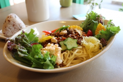 大豆ミート使用!生パスタのベジジャージャー麺ランチ!!ミニおにぎり付き ¥900ピリ辛のお味噌とシャキシャキお野菜、生パスタの食感がたのしめます♪お野菜がたくさんとれますので、食欲の落ち気味な人は特におススメです!